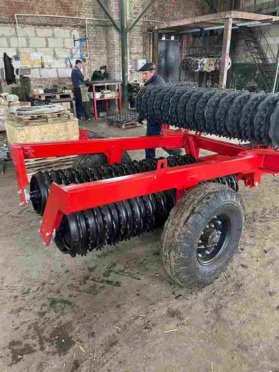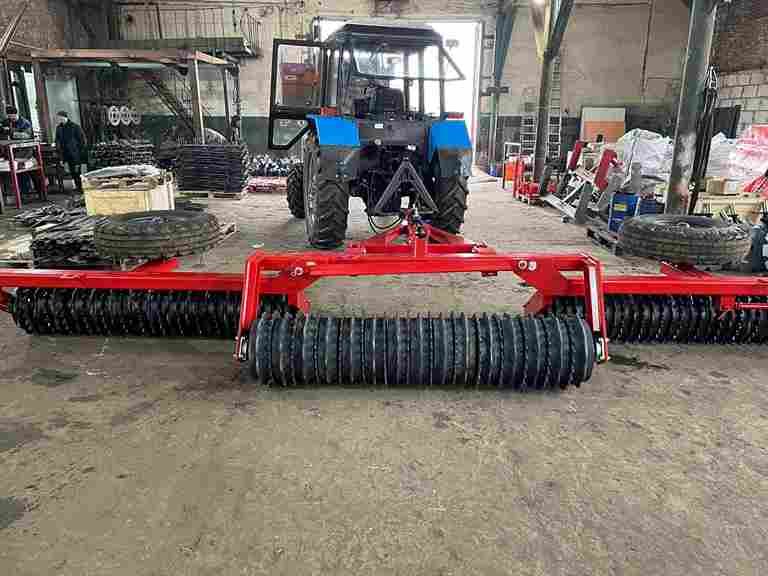 Прицепной каток кольчатый изготавливается шириной 6 метров. Рама выполнена из трубы 150х100х8, на катке установлены литые чугунные диски. Вал шестигранный, диаметром 55мм.